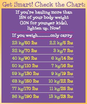 - Elementary students should not carry more than 10% of their body weight. (eg. If your child is 80 pounds, they shouldn’t carry more than eight pounds- or the equivalent of a pair of shoes, a snack, drink and 2-3 textbooks). SEE THE TABLE BELOW.