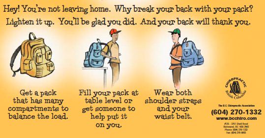 The British Columbia Chiropractic Association has provided us with the “Pack it Light. Wear it Right” backpack safety program to drastically reduce the risk of injury and support your child’s physical development.